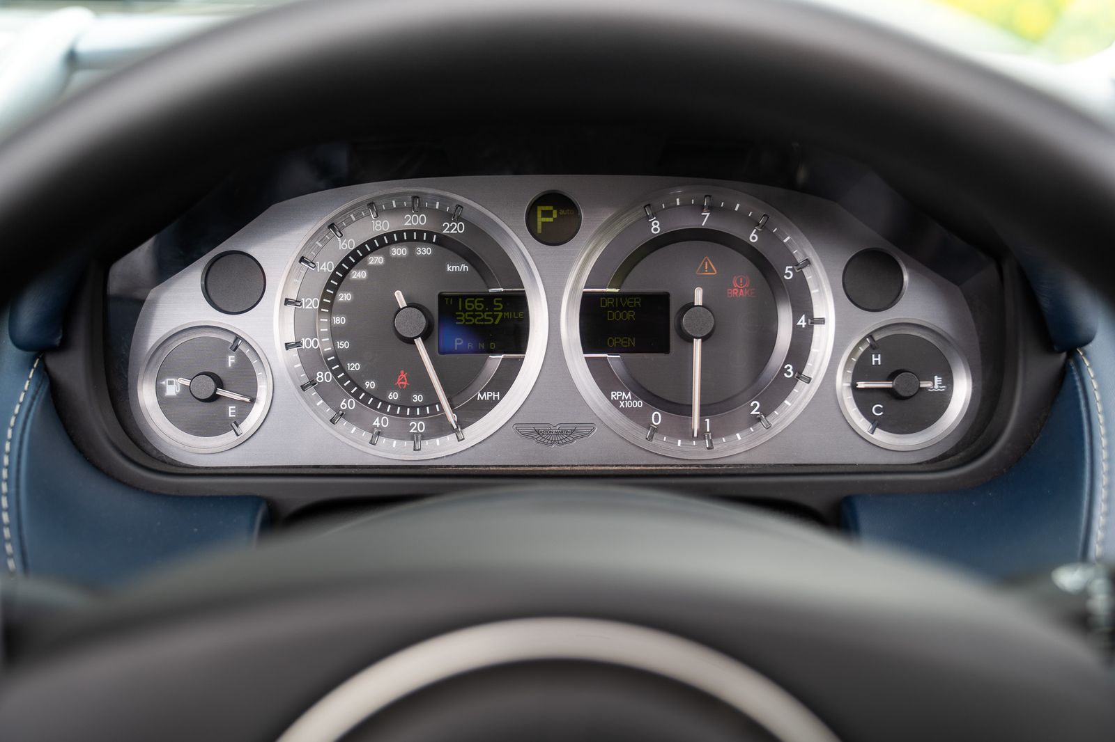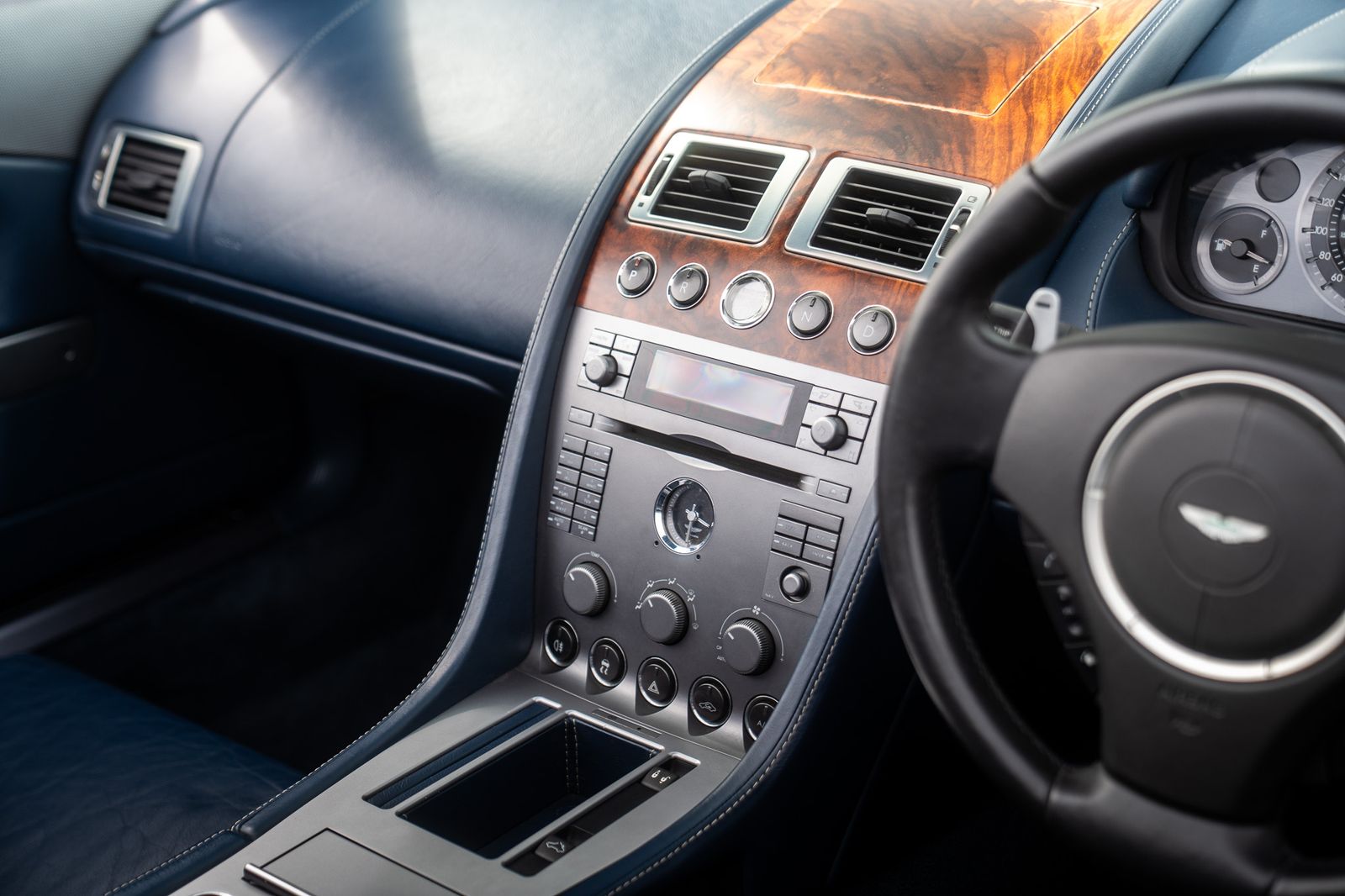 What makes this particular car so appealing is not simply the model itself, but the way it has been specified and the way it presents in the photographs. The colour combination is outstanding, with the deep blue exterior working perfectly alongside the matching hood and rich blue leather cabin, giving the car a highly cohesive and unusually elegant feel. The images also show the car sitting beautifully on its silver multi-spoke alloy wheels, while the interior displays the classic Aston Martin blend of hand-finished leather, metal detailing and traditional wood veneer trim across the centre console and dashboard. Those details give this DB9 exactly the sense of occasion you would hope for from an Aston Martin of this era.