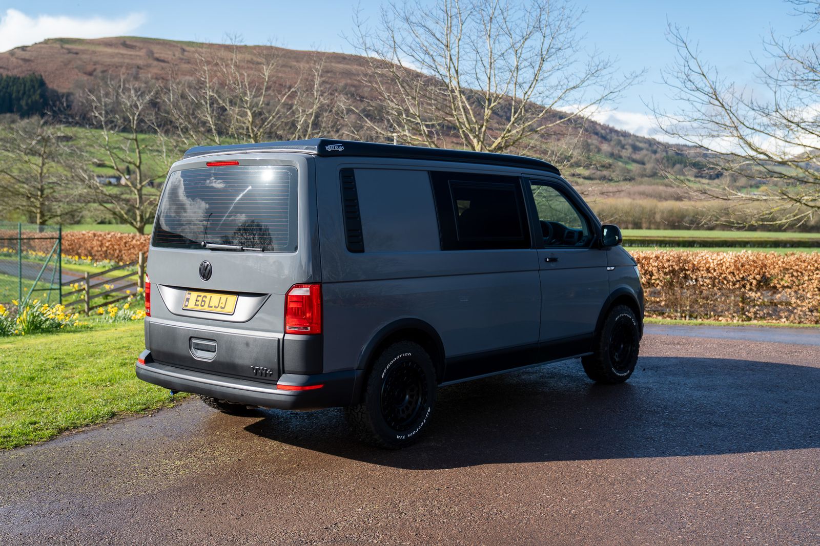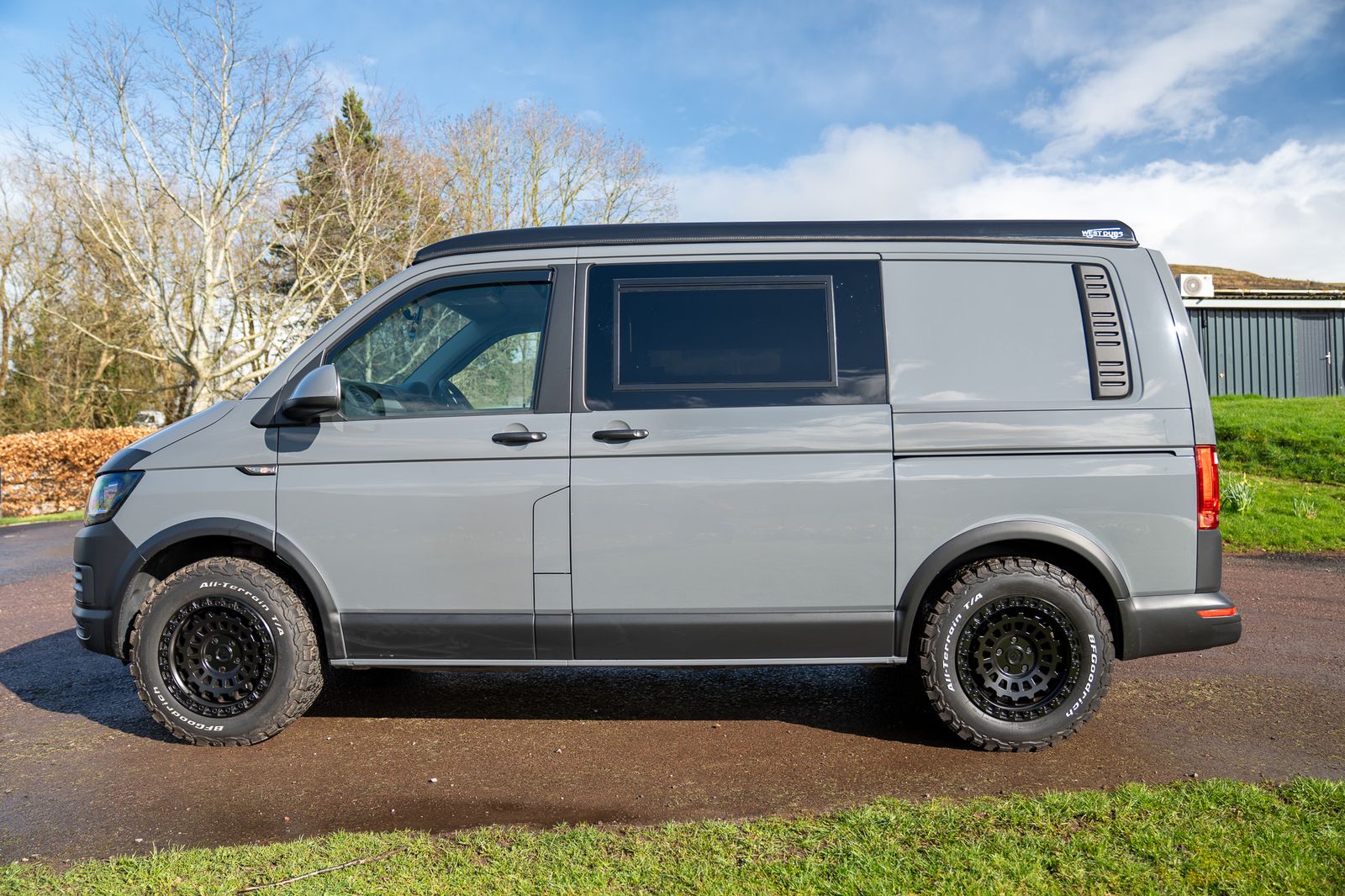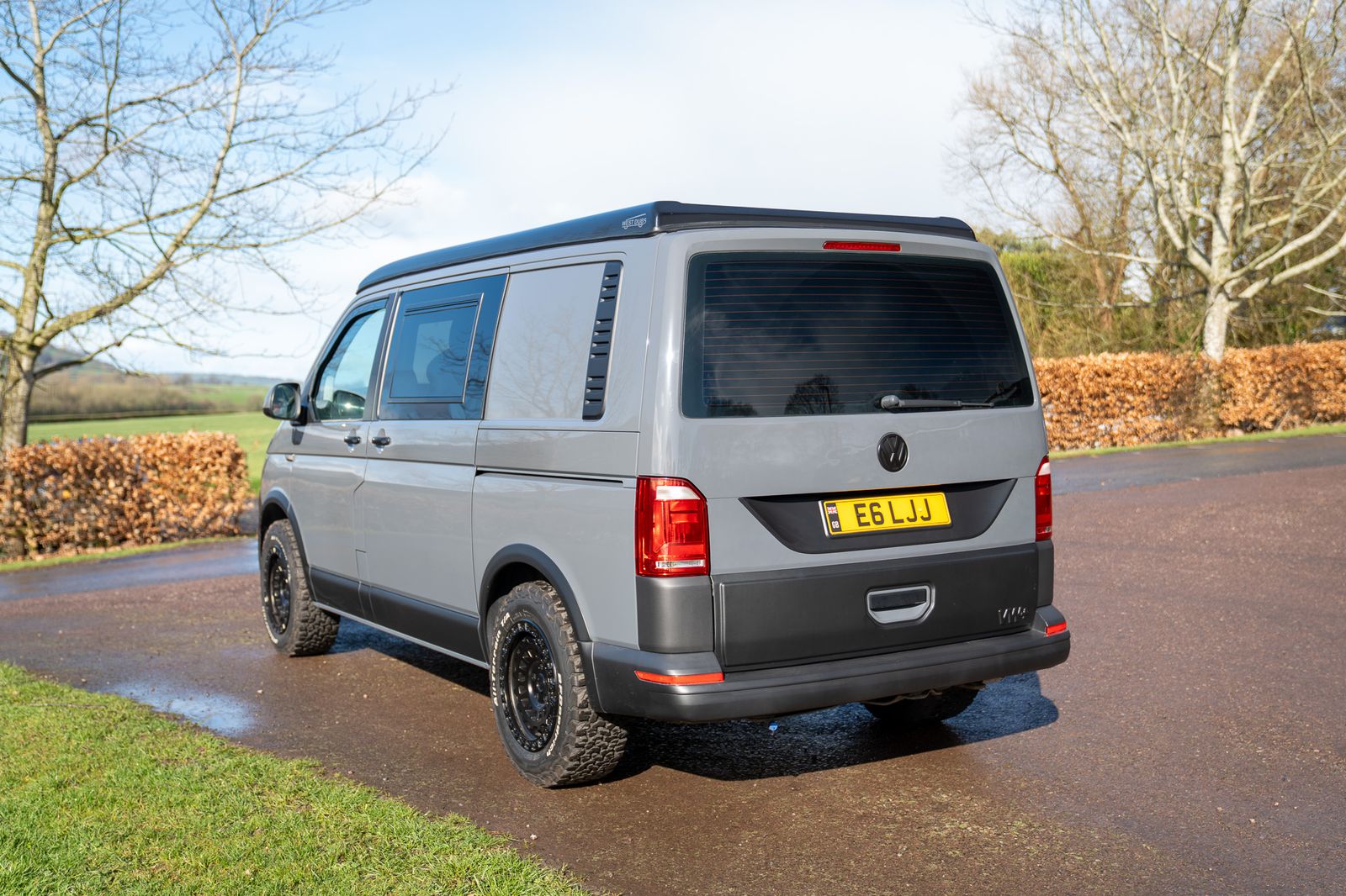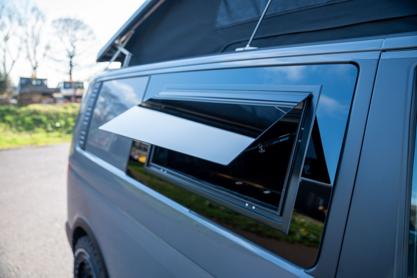 Finished in factory Pure Grey, this 2017 Volkswagen Transporter T6 is a superbly built campervan that combines aggressive swamper styling with a high quality, thoughtfully designed camper conversion. Starting life as a Kombi, it benefits from factory cut window openings and a tailgate with heated OEM rear window, perfectly matched to the Transporter HQ Safari windows.