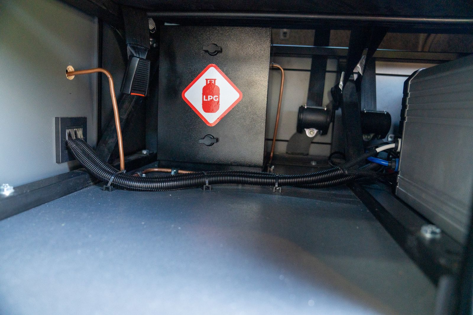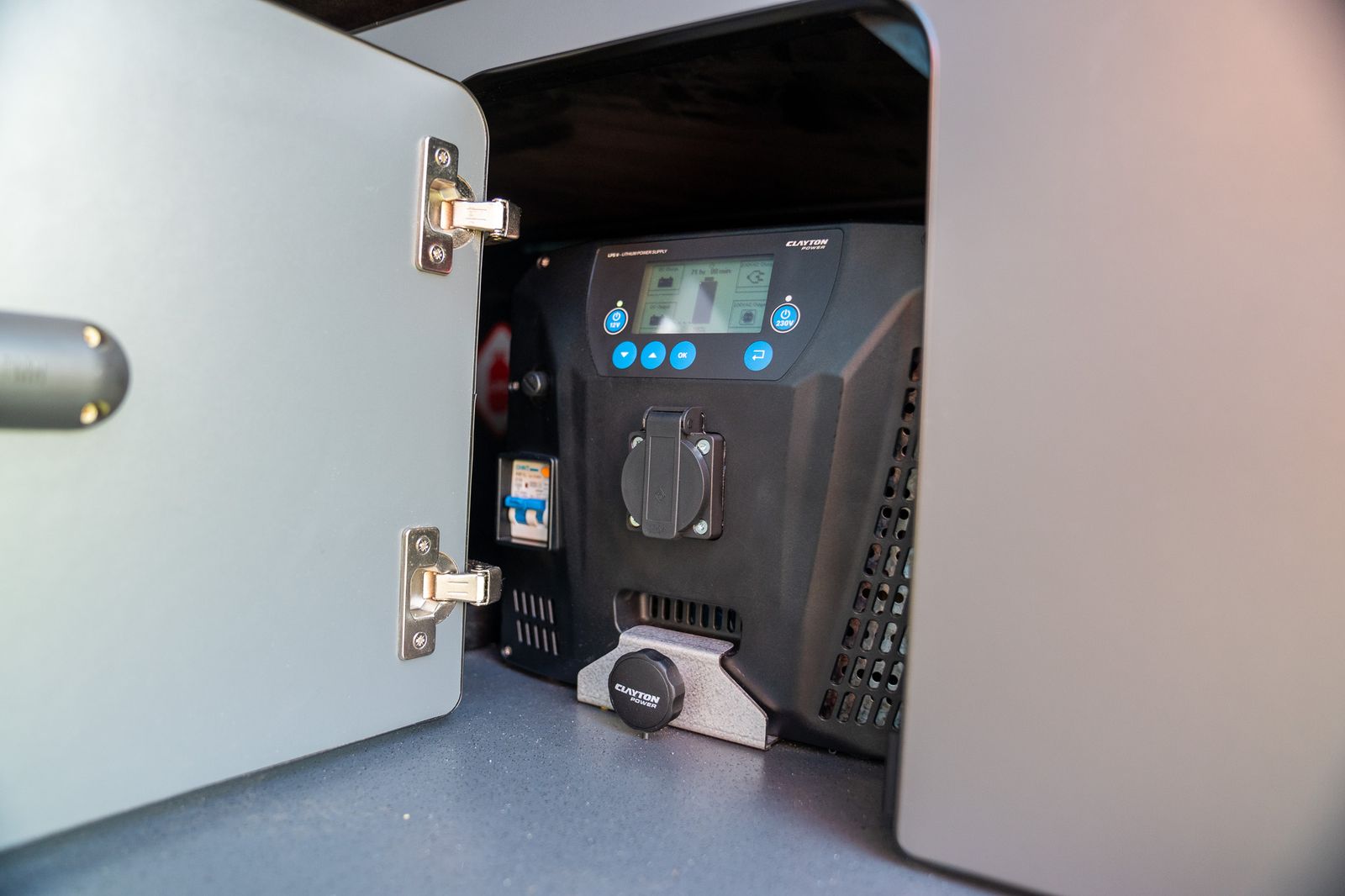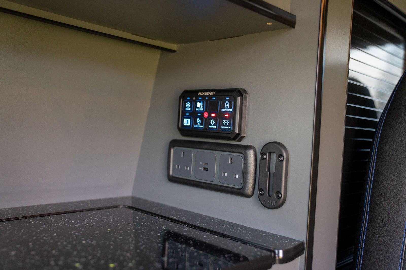 A major highlight of this camper is its impressive electrical and utility setup. It features a Clayton Power LPS 2 lithium system with both 12V and 230V capability, complete with Clayton remote, together with a Clayton 600W DC-DC Supercharger. There is also an AUXBEAM RGB smart control panel and fuse board, stealth electric hookup and an Autoterm 2k diesel heater, making this a van that is properly equipped for weekends away or longer trips.