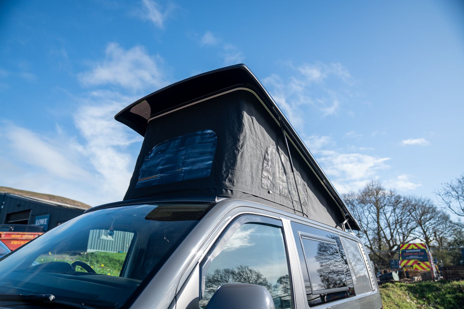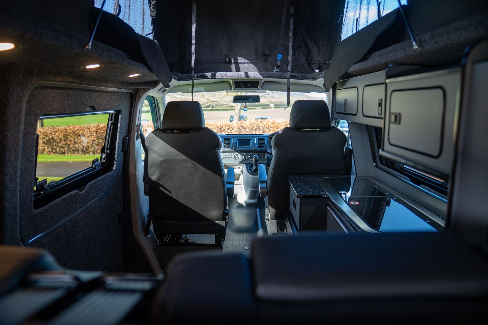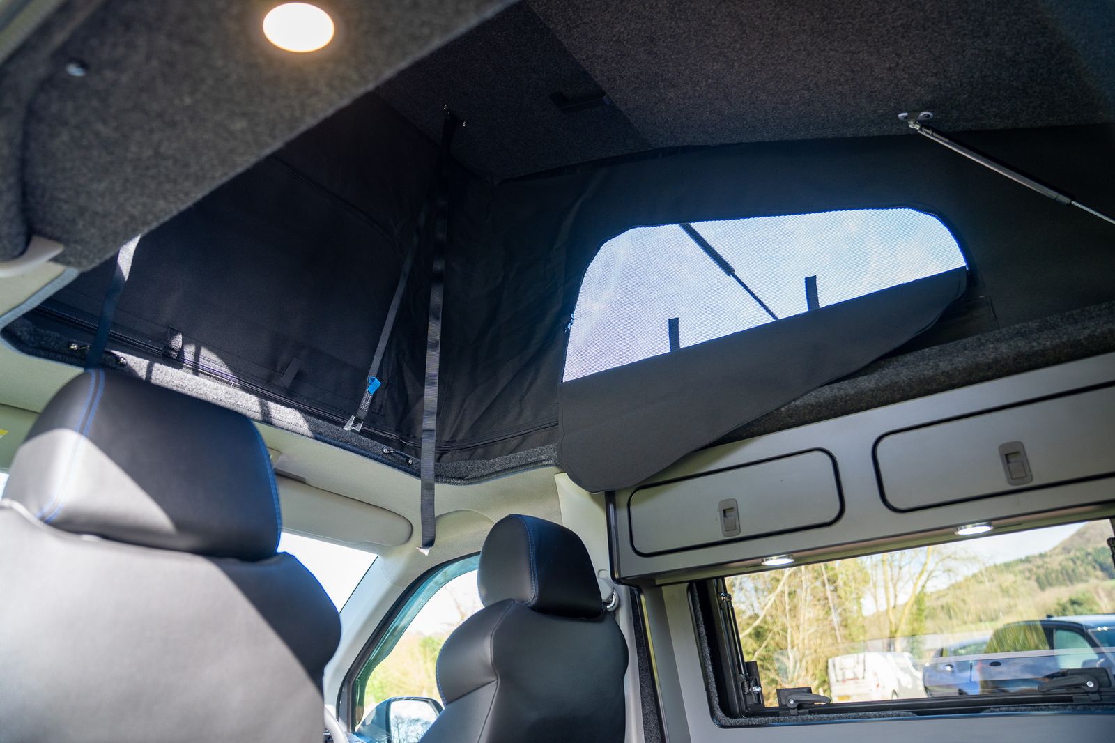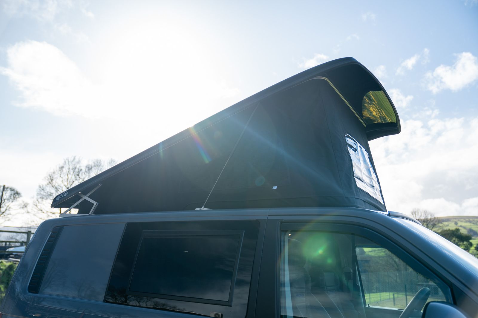 The camper conversion has been completed to a very high standard and offers excellent usability. Designed as a 4 berth camper, it features a Westdubs pop-top fitted in December, complete with anthracite carpet, upgraded black heavy duty Sauleda Scenic blackout canvas, a full-width bed on gas struts and trimmed frames for a quality finish.