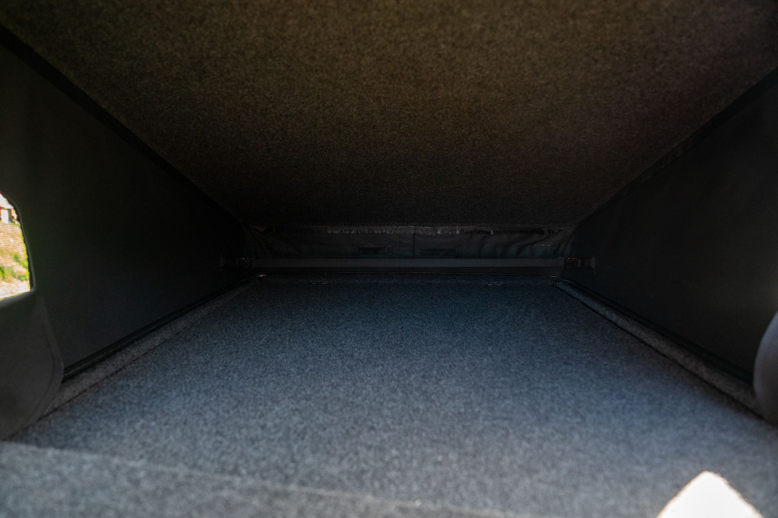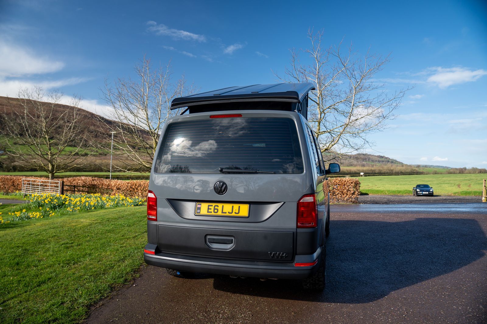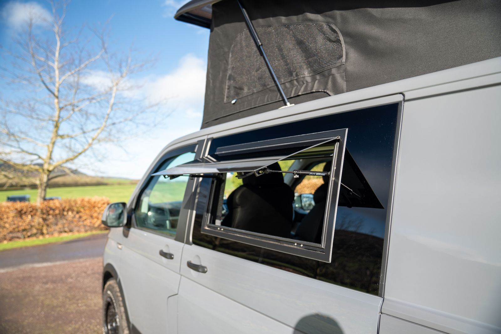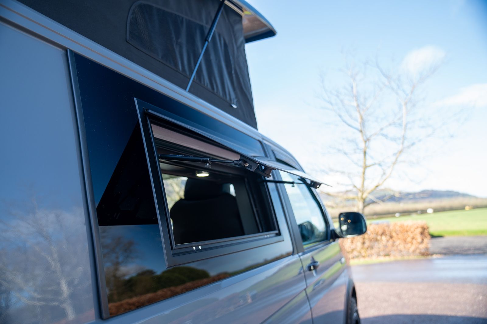 The camper conversion has been completed to a very high standard and offers excellent usability. Designed as a 4 berth camper, it features a Westdubs pop-top fitted in December, complete with anthracite carpet, upgraded black heavy duty Sauleda Scenic blackout canvas, a full-width bed on gas struts and trimmed frames for a quality finish.