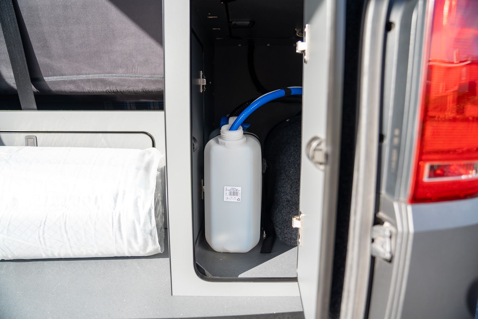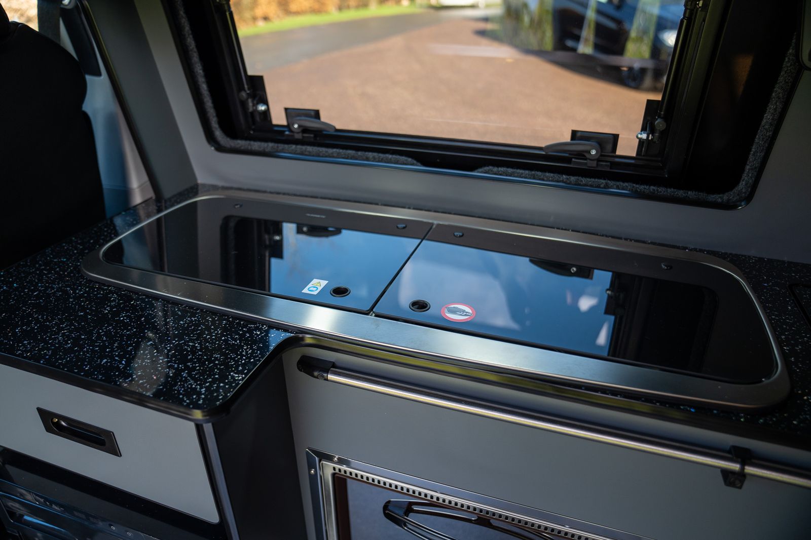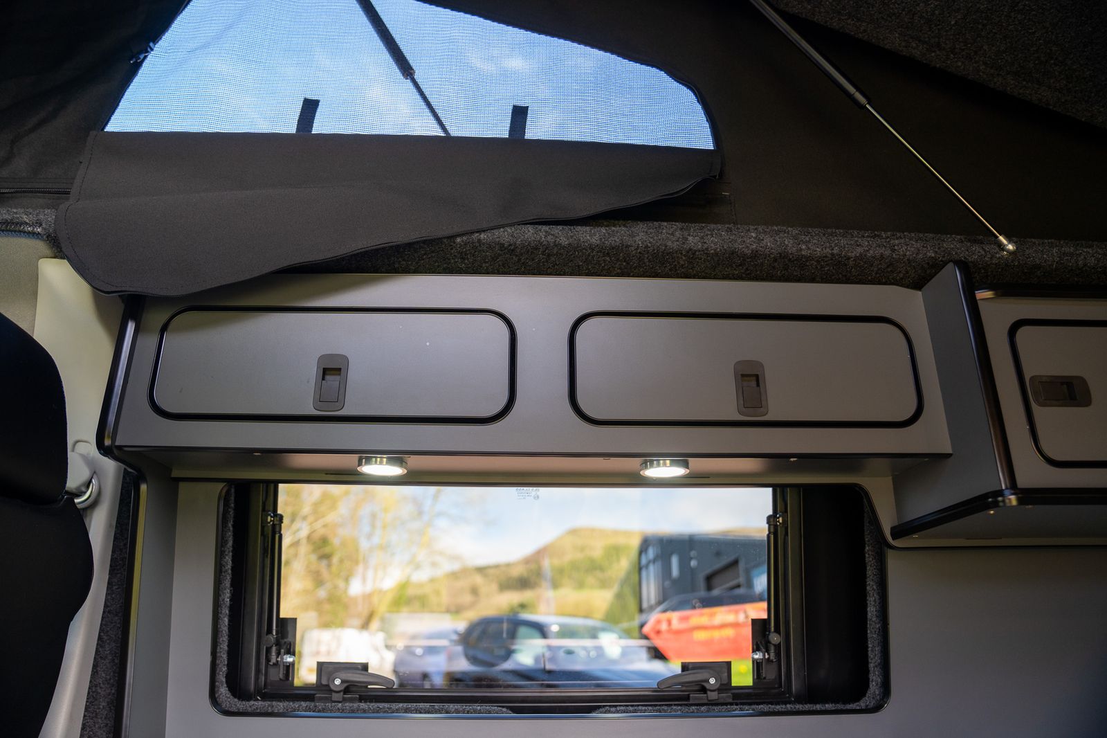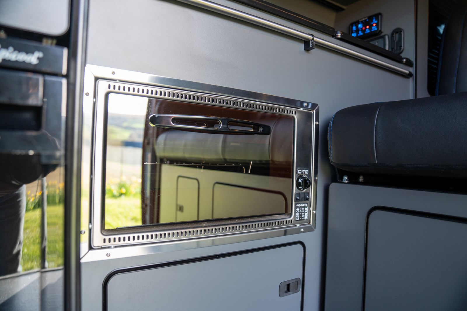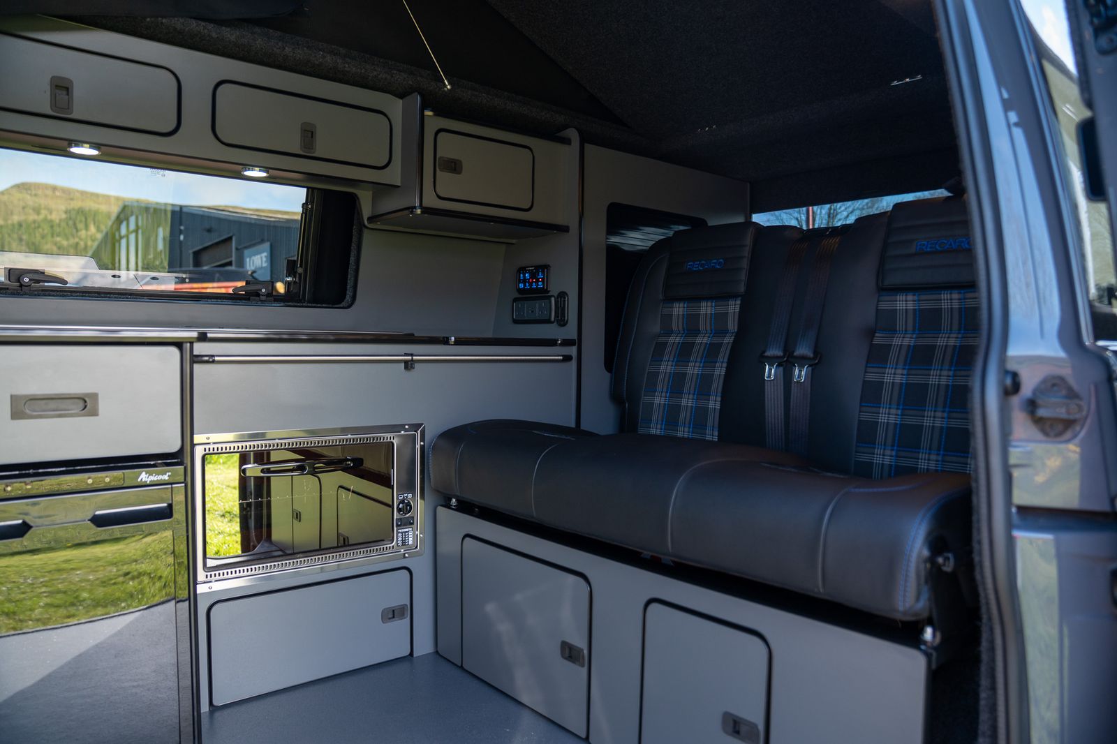 The kitchen has also been very cleverly designed and is finished in Moreland lightweight graphite grey laminated ply. Custom CNC cut to maximise both storage and practicality, it includes a pop-up worktop cupboard with lift-up internal shelf, a Dometic FO211GT grill and oven, Dometic 9222 two-burner hob and sink, and an Alpicool CRX-50 black fridge.